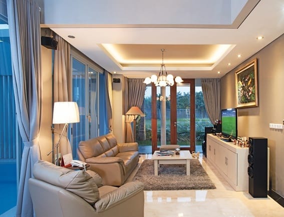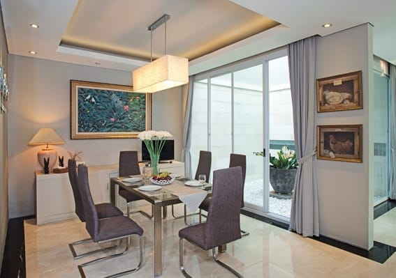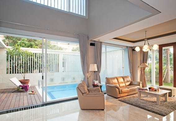 Untuk menyiasati lahan yang cukup terbatas, hunian ini meminimalkan penggunaan sekat. Keberadaan void dari lantai dua pada ruang keluarga dan bukaan-bukaan kaca yang lebar ke arah taman atau ke arah kolah renang menambahkan kesan lapang pada hunian.
