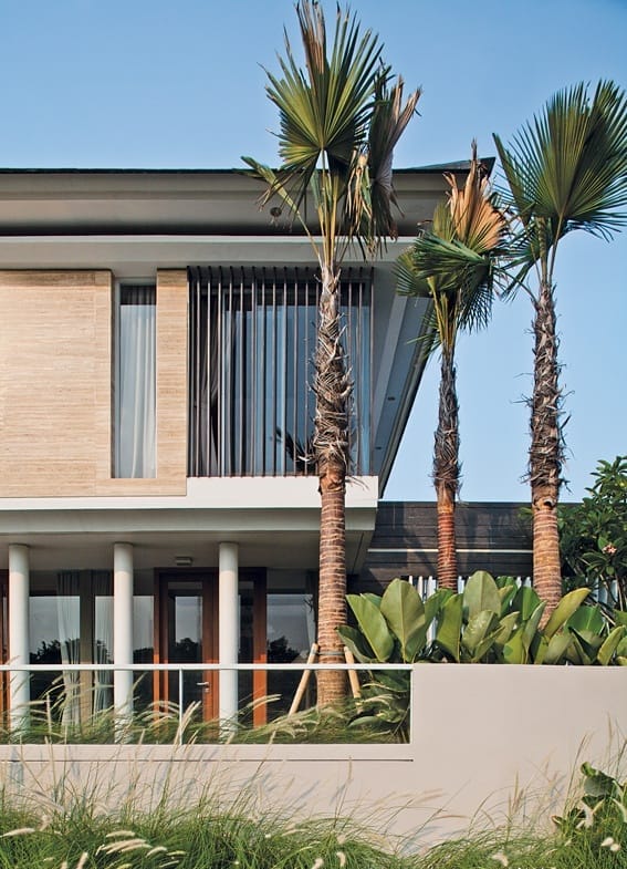 Pada bagian taman di depan rumah ditanam beberapa pohon palem untuk menguatkan kesan hunian tropis. Adapun pada bagian samping hunian, yang terdapat kolam renang, menjadi pusat orientasi visual bagi ruang keluarga dan kamar tidur utama.