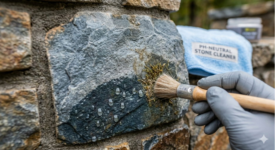 Kamu bisa memulai dengan menyikat seluruh permukaan menggunakan sikat nylon yang lembut dan air bersih mengalir. Untuk noda membandel seperti kerak semen atau lumut yang sudah menetap, gunakan larutan pembersih khusus batu alam dengan pH netral, hindari deterjen rumah tangga yang terlalu alkalis karena bisa merusak porositas batu.