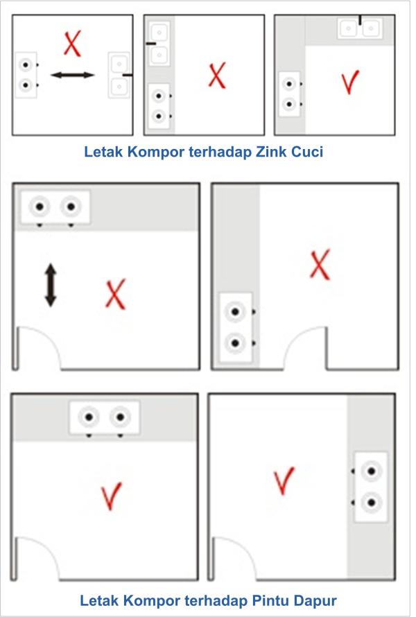 - Kompor jangan diletakkan di bawah toilet, kamar mandi, pipa air yang melintang, bak penampungan air (tandon), karena tempat-tempat tersebut mengandung lebih banyak energi negatif yang bisa turun dan mengurangi keharmonisan.