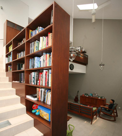 Sementara itu, rak buku dibuat berundak-undak mengikuti bentuk tangga. Dari sisi tangga, rak buku ini juga berfungsi sebagai pembatas area tangga dan pengganti railing.