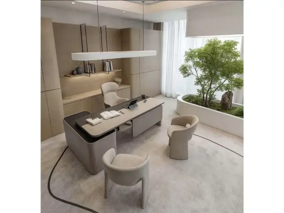 Konsep minimalis terlihat dari palet warna yang dominan beige dan abu-abu lembut. Meja kerja utama memiliki bentuk yang ergonomis dan modern dengan finishing kombinasi abu-abu dan cokelat muda, memberikan ruang yang nyaman untuk bekerja dan berdiskusi.