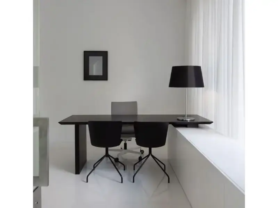 Meja kerjanya berwarna hitam pekat, ditemani dua kursi tamu yang juga hitam dengan kaki-kaki yang unik. Di atas kabinet putih, ada lampu meja besar dengan kap hitam yang menambah kesan dramatis dan stylish.