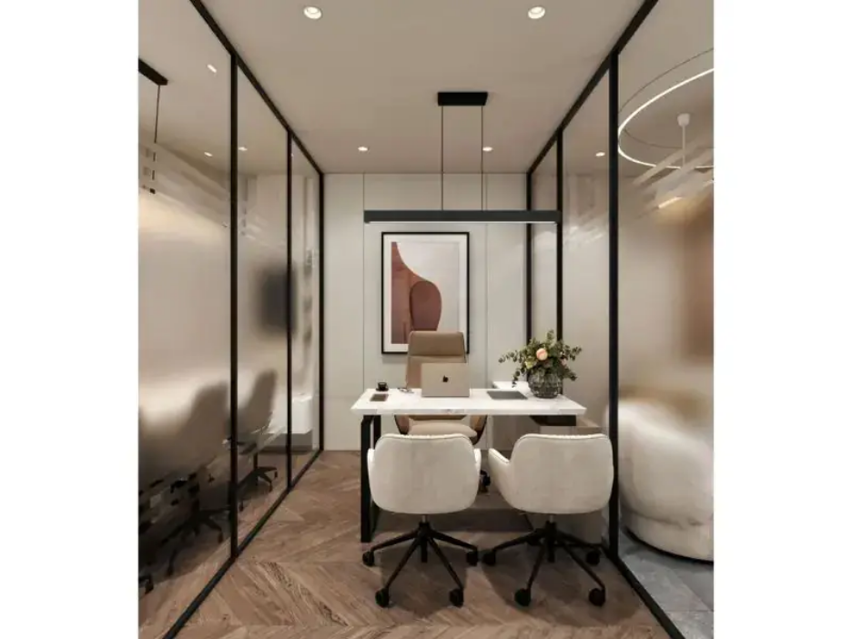 Ruangan ini menggunakan partisi kaca berbingkai hitam, yang sebagiannya dilapisi stiker frosting (buram). Lantai kayu dengan motif herringbone berwarna cokelat hangat menjadi pondasi yang kontras dengan dinding putih dan furnitur.