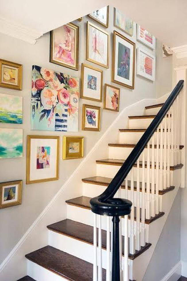 Ini merupakan cara paling mudah. Anda dapat menghias dinding di sepanjang tangga dengan beragam ornamen sehingga terlihat seperti dinding galeri. Anda dapat memajang foto berbingkai, atau hiasan dinding lain, seperti lukisan, piring-piring cenderamata dari mancanegara, artwork, kata-kata mutiara berbingkai, dan sebagainya.