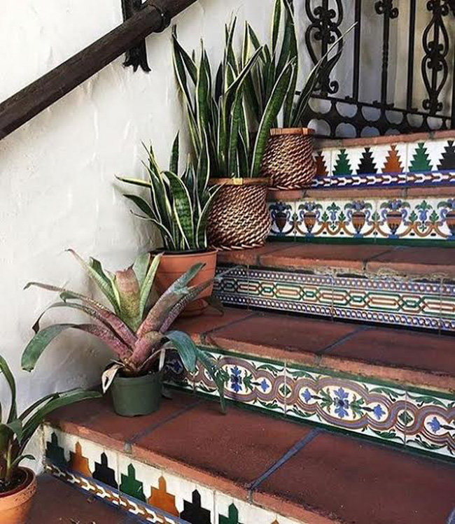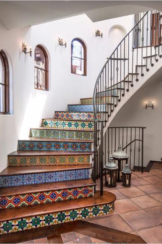 Gunakan untuk menghias anak tangga, bisa seluruhnya atau hanya bagian depan anak tangga. Penggunaan ubin bermotif akan membut area tangga lebih berwarna.