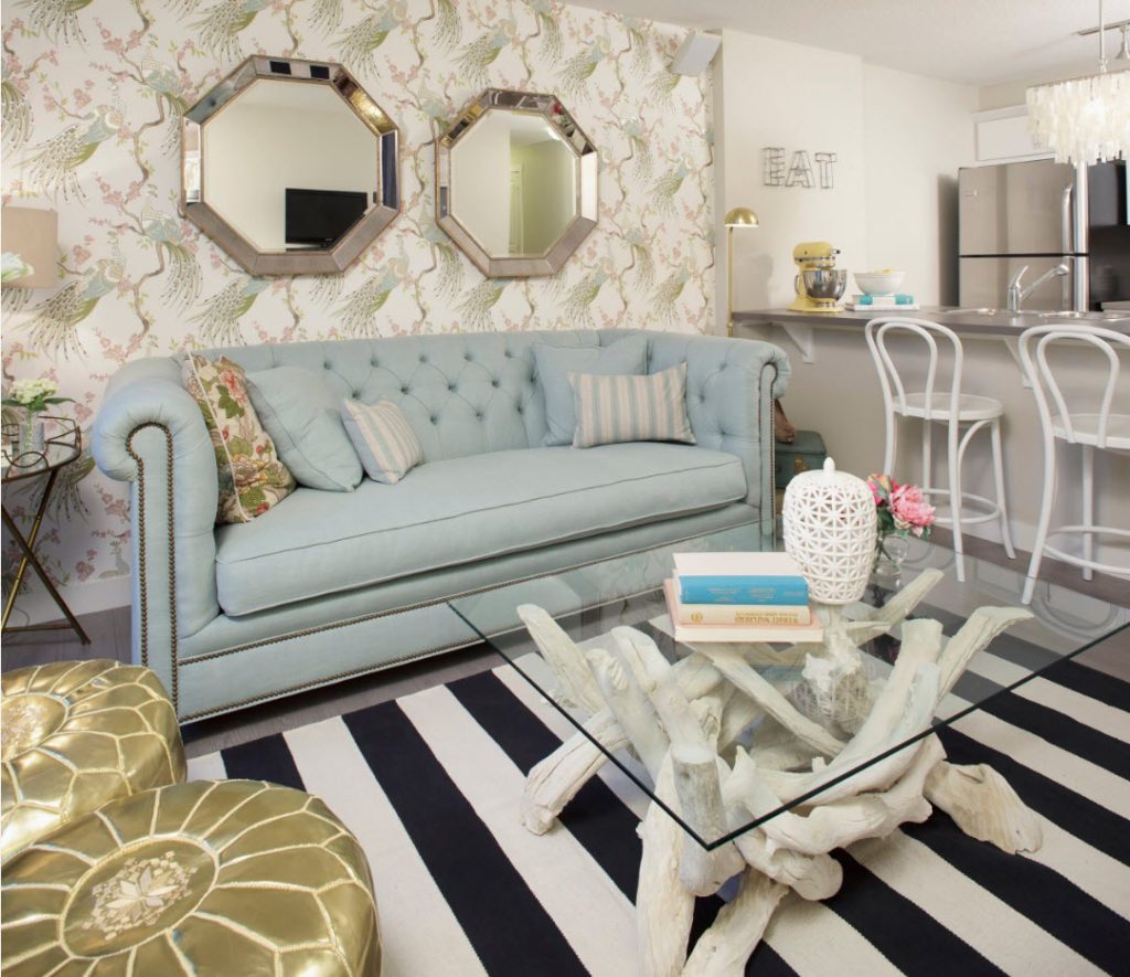 Tidak perlu selalu terpaku dengan interior minimalis, sebab dengan kalkulasi budget yang tepat, kamu juga bisa menciptakan interior rumah mungil dengan gaya vintage klasik yang manis. Interior rumah mungil ini terlihat mewah karena pemilihan wallpaper yang bernuansa ramai dan sebuah sofa 2 dudukan berwarna lembut plus peletakkan meja tamu yang unik beralas karpet monokrom.