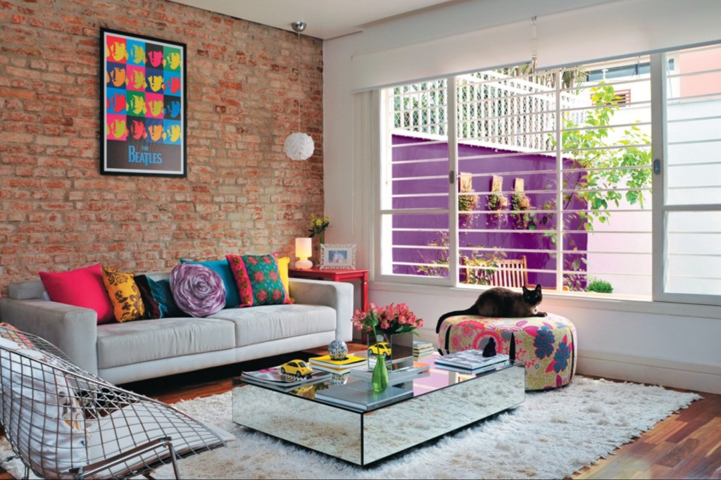 Interior rumah mungil ini tidak perlu banyak polesan, tapi kesan originalitas yang semakin membuatnya nyaman dan gaya. Dengan dinding bata yang dibiarkan terbuka, ada kesan rustic yang muncul dengan kombinasi furnitur modern berwarna-warni. Sedangkan bagian dinding satu lagi didominasi dengan jendela yang dihiasi tirai dan gorden, terbuka dengan teralis besi yang mudah dibersihkan setiap saat.