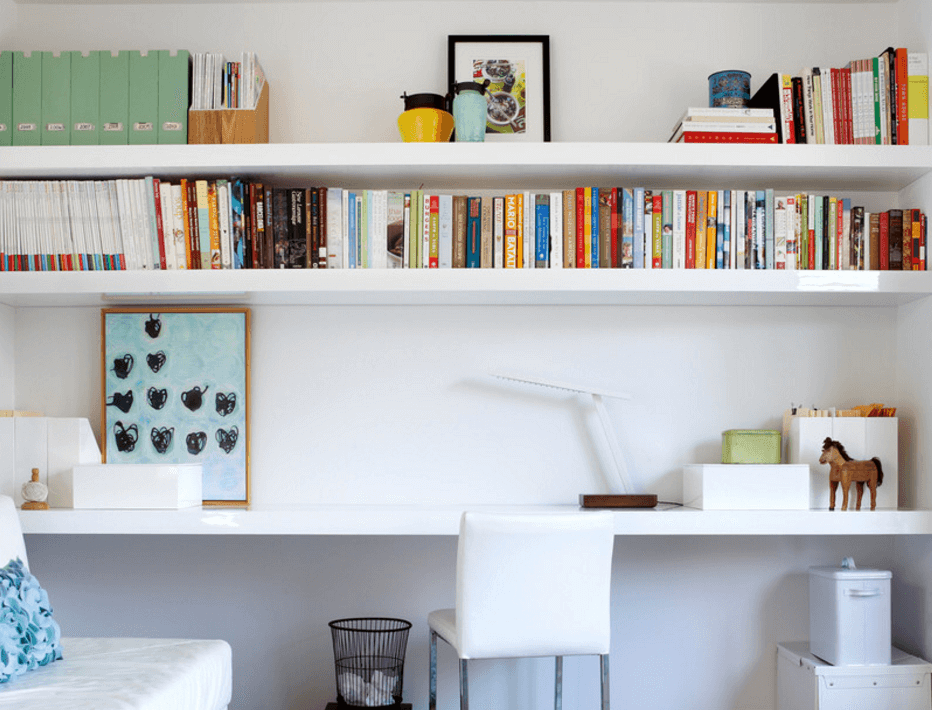 Sudut ruangan yang biasanya suram, apalagi jika ditambah dengan barang-barang yang menumpuk, cenderung membuat area tersebut dihindari oleh penghuni rumah. Dengan menggunakan warna netral terang untuk rak dinding minimalis di sudut ruangan, kamu tidak hanya jadi punya tempat penyimpanan barang, tapi juga dapat menciptakan ilusi ruangan yang lebih besar karena adanya tempat pemantulan cahaya yang baru.