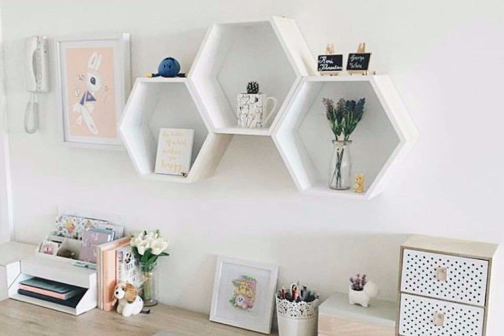 Selain untuk tempat menyimpan barang-barang, rak dinding minimalis model heksagon ini juga bisa dijadikan galeri di sekitar sudut ruangan, lho.