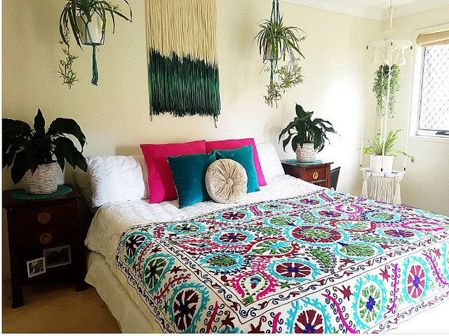 Pilihlah putih sebagai warna dinding kamar apartemen bohemian Anda, kemudian hiasi dengan aneka motif pada spresi, ataupun karpet. Motif-motif ala boho juga dapat dihadirkan pada selimut, bantal hingga kain motif yang Anda gunakan sebagai hiasan dinding.