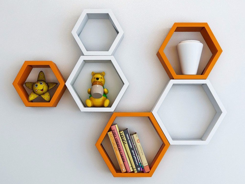 Jika bosan dengan floating shelves bergaya standar, kamu juga bisa berkreasi membuat floating shelves berbentuk hexagon atau segitiga yang tentu memberikan kesan unik pada ruangan.
