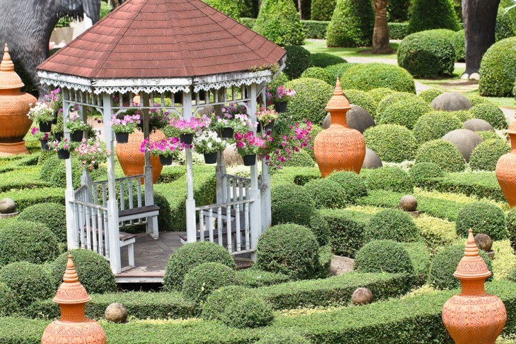 Taman Perancis terkenal dengan penataan tanaman yang simetris dan dekorasi taman yang cantik. Salah satu dekorasi tersebut adalah gazebo minimalis ala Perancis. Gazebo minimalis ini biasanya dibuat menggunakan kayu yang dicat warna putih. Bagian atasnya menggunakan atap berwarna cokelat. Sifatnya semi terbuka. Biasanya gazebo minimalis ini ditambahkan beberapa pot gantung berisi bunga warna-warni dan lamput kecil.