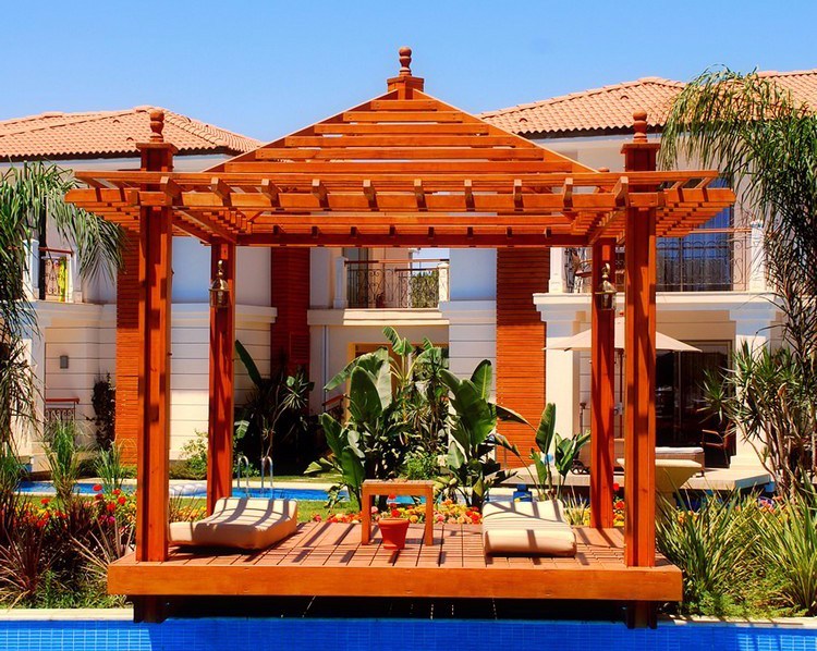 Gazebo minimalis yang pertama dibangun menggunakan 100% material kayu. Desainnya sederhana dan atapnya dibiarkan berongga. Rongga-rongga pada atap gazebo minimalis ini membuat kamu bisa berjemur di bawah matahari setelah berenang tanpa harus merasa terlalu panas atau silau.