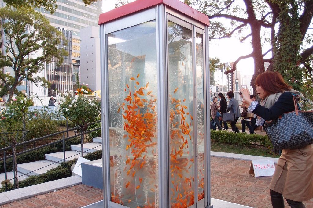 Akuarium unik yang satu ini sangat eye catching. Sekilas, akuarium unik ini memang tampak seperti telepon umum yang tersebar di berbagai kota di Jepang. Tapi berkat tangan dingin para mahasiswa seni dan desain dari universitas Kyoto yang menyebut diri mereka Kim Yo Bu, telepon umum ini sudah berubah wujud menjadi sebuah akuarium unik yang menampung banyak ikan mas. Tentu saja, kehadiran akuarium unik berbentuk telepon umum ini memberi kesan unik terhadap penikmatnya.