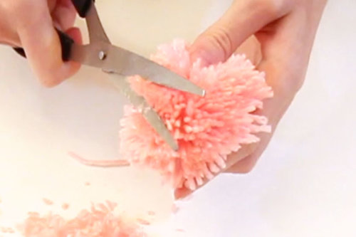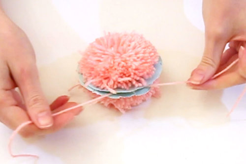 Ikatkan sepotong wol dengan warna yang sama di sekitar pom pom di antara dua keping kartu. Pastikan Anda menariknya dengan erat dan mengikat simpul ganda! Pangkas ujung dari wol ini dan robek kartu dan Anda memiliki pom pom Anda.