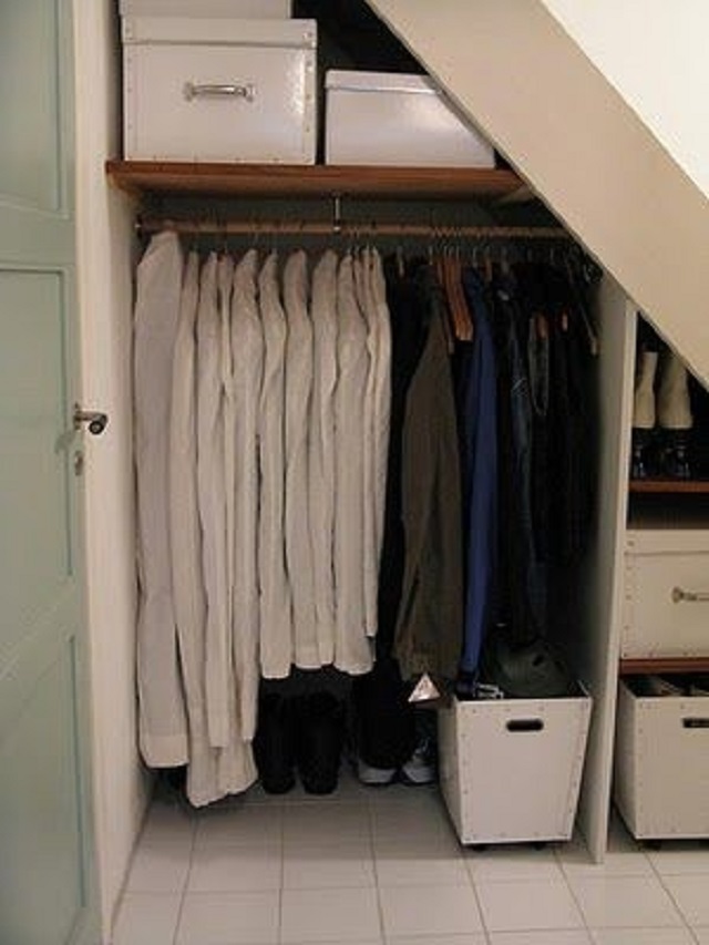 Sudut ruang yang berada di bawah tangga merupakan area yang paling unik dan dapat Anda kreasikan sebebas-bebasnya. Sudut di bawah tangga biasanya memiliki space yang cukup luas sehingga Anda dapat meletakan sebuah lemari kustom. Dalam almari tersebut Anda dapat menyimpan sepatu dan menggantung baju. Selain sebagai lemari pakaian, Anda juga dapat memfungsikannya sebagai tempat penyimpanan makanan dan peralatan memasak.