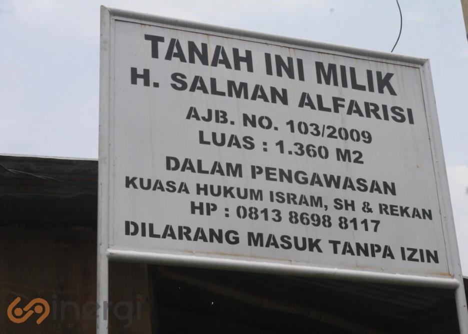Plang juga mencantumkan bahwa tanah berada dalam pengawasan kuasa hukum disertai nomor kontak sebagai rujukan.