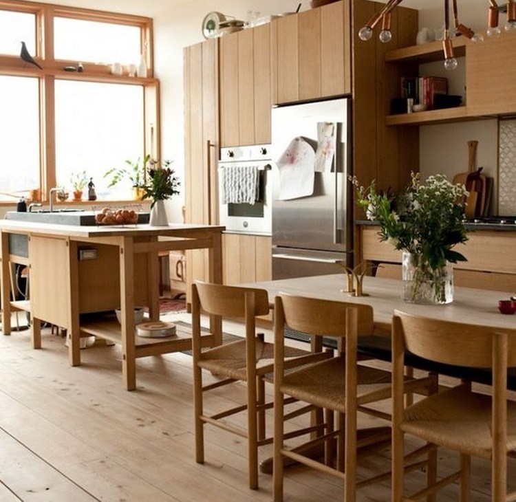 Penggunaan material kayu diseragamkan untuk semua bagian mulai dari lantai, meja, kursi, dan lemari. Semuanya memiliki warna yang sama. Jendela persegi berukuran besar memungkinkan sinar matahari masuk menyinari area dapur ini.