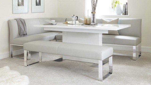 Kursi makan, terutama unit sudut, adalah cara yang bagus untuk memanfaatkan setiap inci ruang. Bangku bisa terselip rapi di bawah meja saat tidak digunakan dan terlihat lebih rapi serta bersih. Didekorasi dengan berbagai hiasan kulit imitasi kontemporer, dari putih sampai abu-abu, dan hitam.