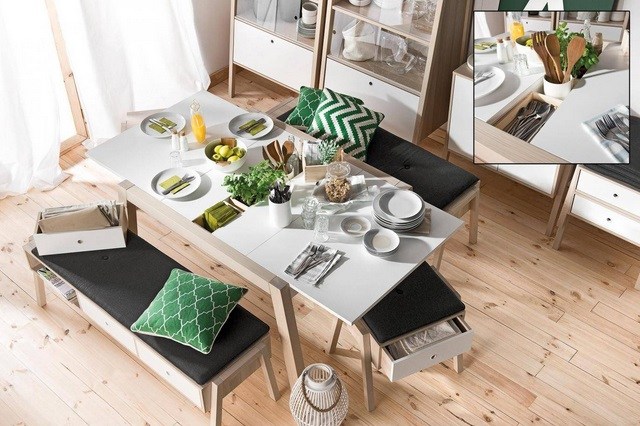 Meja makan fleksibel yang bisa digunakan untuk 6 orang, dan bahkan memiliki pilihan untuk menciptakan ruang di dalam dan di tengah meja, sebagai tempat penyimpanan bumbu dan atau alat-alat makan.