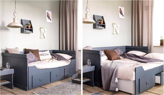 Dapat digunakan sebagai sofa yang sangat nyaman dengan beberapa bantal. Dan juga dapat berubah, bertransformasi menjadi tempat tidur double. Juga dilengkapi tempat penyimpanan untuk beberapa perlengkapan.
