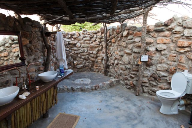 Batu-batuan alam bisa menjadi pilihan penutup dinding agar menambah kesan tropis pada kamar mandi. Sedangkan atapnya menggunakan desain kayu yang semi terbuka. Boleh juga menambahkan item lain seperti kursi kayu sebagai aksen