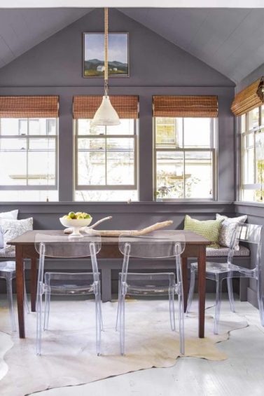 Ruang makan tak perlu menggunakan kursi yang sama, namun bisa menggunakan variasi kursi, bahkan dengan variasi warna. Tambahkan juga aksen-aksen yang menarik di dalam ruang makan, seperti misalnya pajangan ala vintage dan semacamnya.