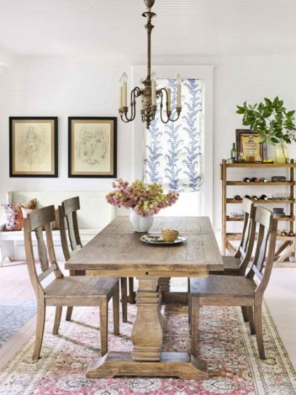 Menambahkan unsur rustic atau ala pedesaan di dalam ruang makan dapat dengan mudah diwujudkan dengan menambahkan furnitur dari kayu yang dipertahankan warna aslinya. Desain meja dan kursi pun juga nggak neko-neko, tradisional dan nyaman.