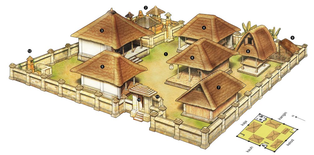 Setiap rumah Bali khususnya rumah tradisionalnya, dibangun mengikuti aturan bernama Asta Kosala Kosali, yang sama dengan aturan Feng Shui dalam kebudayaan Tiongkok. Kosala Kosali menjadi patokan arah dan sudut pada setiap rumah tradisional di Bali. Secara umum, sudut utara-timur adalah area suci sehingga pura di dalam rumah harus berada di sudut ini. Sementara sudut selatan-barat dianggap lebih rendah.