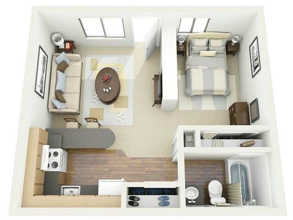 Jika kamu merencanakan memiliki hunian yang mungil, kamu bisa mencontek sketsa rumah minimalis berkonsep open plan ini.Meskipun ukurannya mungil, tapi minimnya sekat antar ruang memberikan kesan yang lapang dan luas. Untuk menjaga privasi di area tidur, kamu bisa membuat sekat berukuran tiga perempat dinding yang sekaligus bisa digunakan untuk menempelkan TV.