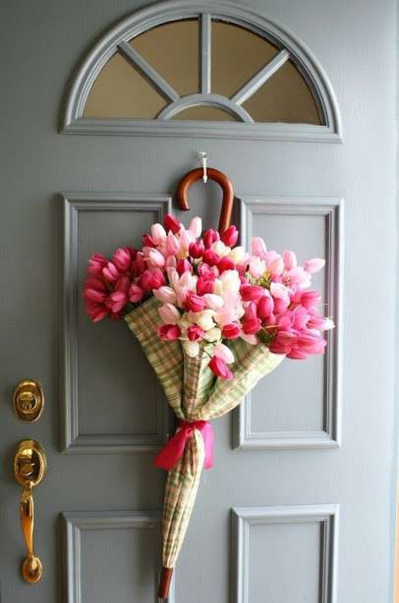 Punya payung yang sudah tidak lagi berfungsi? Dari pada jadi sampah dan di masukkan di gudang, lebih baik dijadikan hiasan ruangan saja. Kamu tinggal menyematkan bunga-bunga imitasi ke dalam payung bekas dan mengikatnya dengan pita agar membentuk buket. Kamu bisa menggantungkan hiasan ruangan dari payung bekas ini pada pintu supaya pintu ruangan lebih ceria dan punya ciri khas.