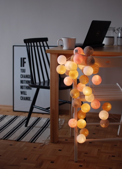 Untuk hasil dekorasi yang lembut dan unik, gantungkanlah untaian lampu yang berada di dalam lilitan benang. Kamu tidak perlu khawatir benangnya akan terbakar karena panas lampu, karena bentuknya menyerupai bola dan tidak langsung menempel pada bohlam. Dekorasi lampu ini cocok untuk digantungkan di kamar tidur atau halaman belakang rumah.