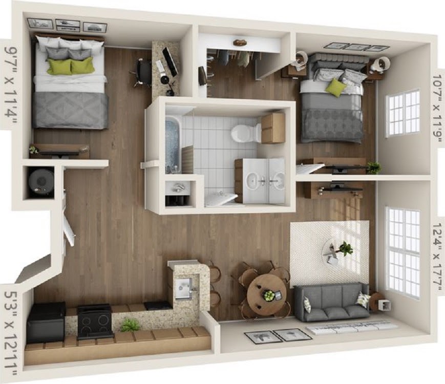 Tanpa mengurangi kesan mewah pada desain rumah type 45 ini, kamu bisa menambahkan rak dinding atau lampu dinding pada ruang kamar tidur. Selain itu, hal menarik lainnya dari desain rumah type 45 ini ada pada area dapur yang dilengkapi dengan area bukaan khusus sehingga kegiatan memasak pun bisa dilakukan tanpa harus menimbulkan bau tak sedap dari sisa-sisa bahan makanan.