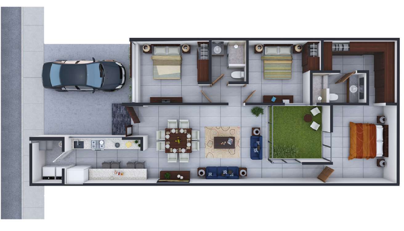 Terdiri dari tiga kamar tidur dengan kasur besar, desain rumah type 45 yang satu ini dapat dijadikan referensi untuk kamu yang ingin menciptakan hunian asri, alami, dan sehat. Bisa terlihat pada contoh gambar, bagian tengah pada desain rumah type 45 ini terdapat area hijau terbuka yang tersambung langsung dengan dua kamar tidur dan ruang tamu. Sementara itu, area dapur dan satu kamar lainnya mendapatkan alur pencahayaan alami dan udara dari halaman depan yang sekaligus difungsikan sebagai carport.