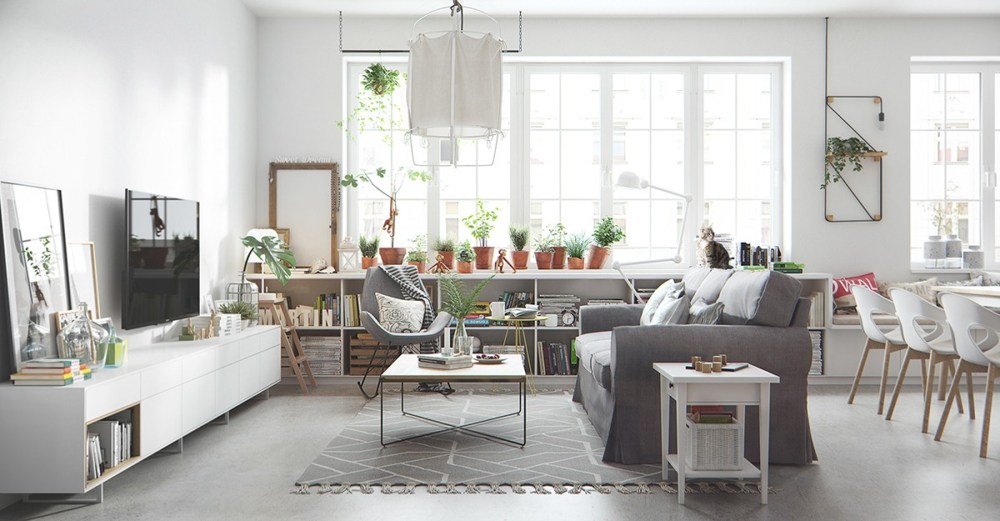 Jika konsep desain ruang keluarga mungil yang serba putih terasa terlalu monoton, kamu bisa memberikan sedikit sentuhan warna natural seperti hijau, bata, dan cokelat pada elemen-elemen dekor pelengkap ruangan untuk memberikan kesan lebih menyegarkan pada desain ruang keluarga yang kamu miliki.