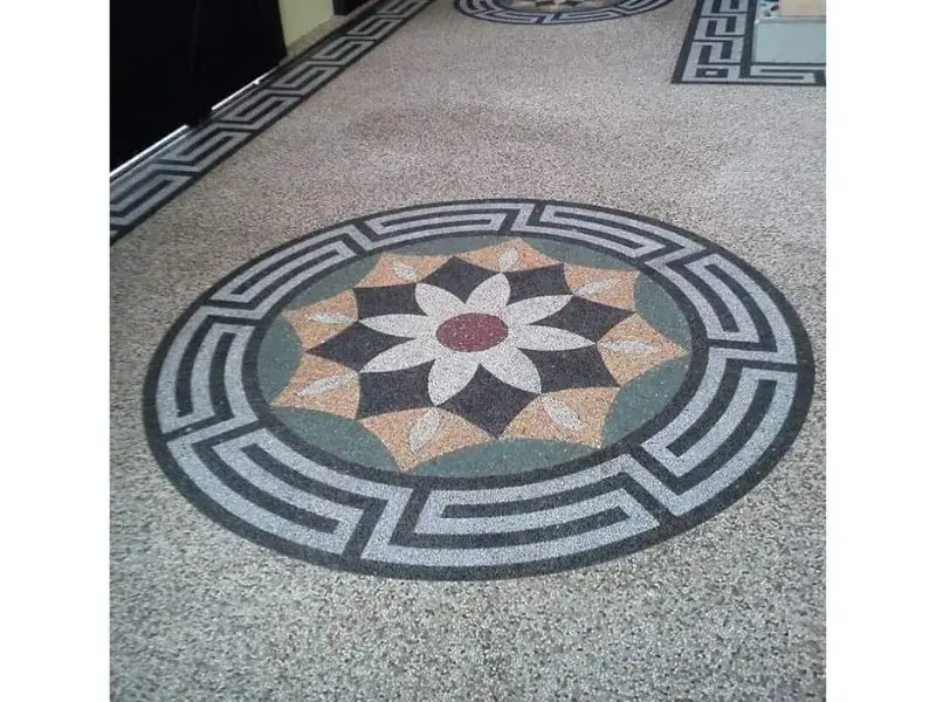 Lingkaran luar setiap medallion dihiasi dengan pola labirin bergaya Yunani Kuno (meander) berwarna hitam dan abu-abu, memberikan kesan dinamis dan artistik.