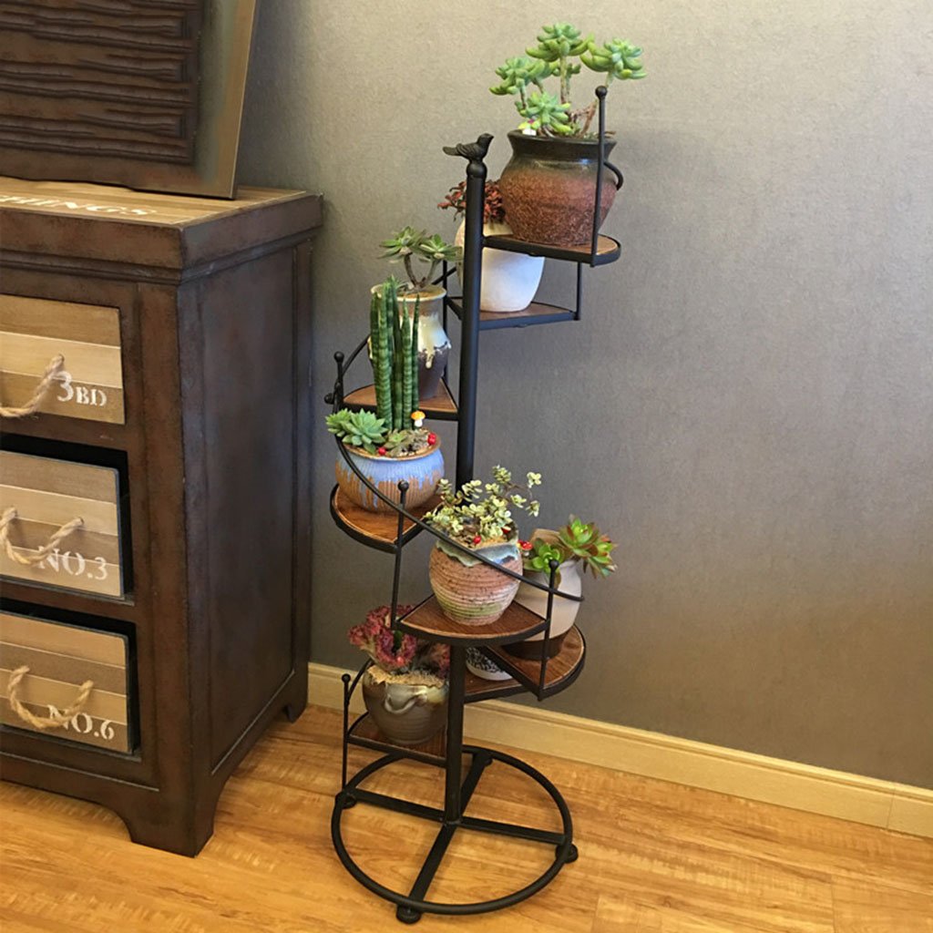 Model rak melingkar. Rak ini berbentuk tangga melingkar yang bisa kamu ini dengan tanaman-tanaman kecil. Rak ini cocok untuk gaya interior industrial. Rak ini juga bisa memberikan sedikit sentuhan industrial pada ruangan yang di tempatinya.