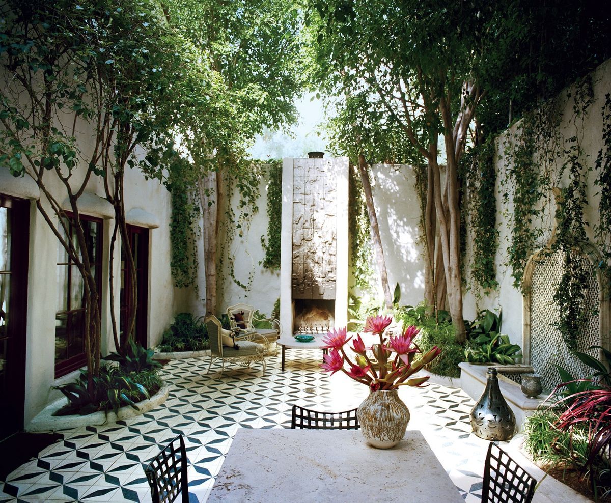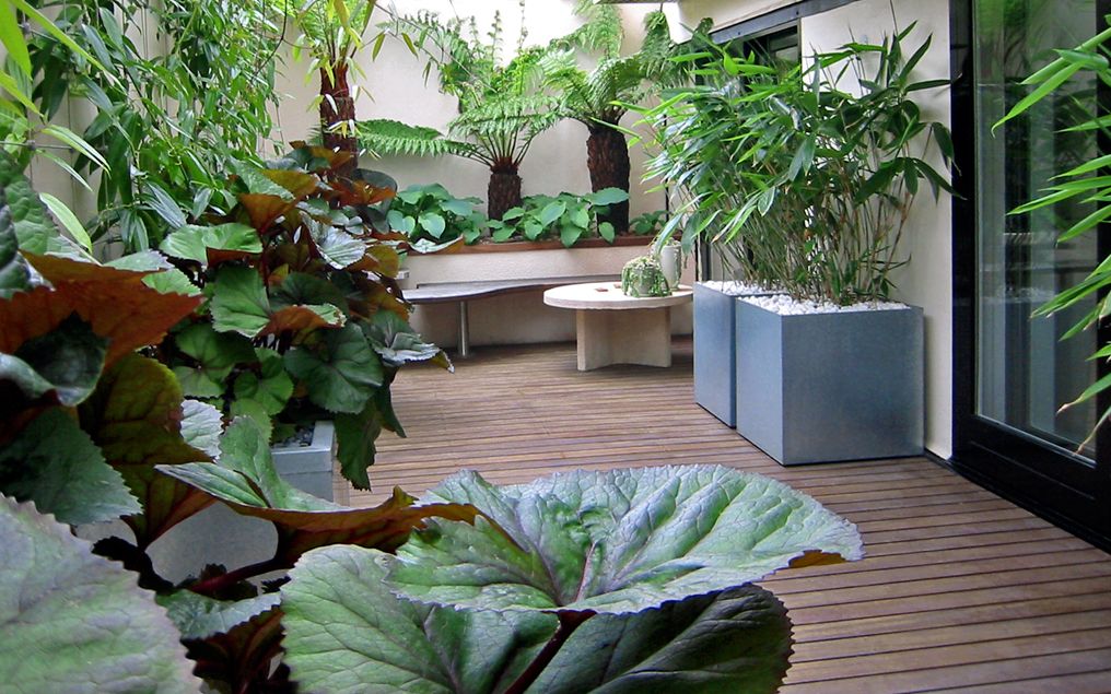 Cara yang paling mudah adalah menghadirkan konsep teras rimbun dengan mengadopsi taman tropis. Gunakan tanaman-tanaman berbatang tinggi dengan daun yang lebar agar kesan rimbun mudah tercipta.