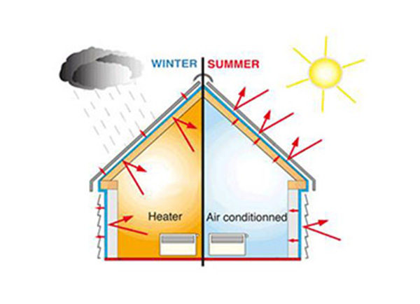 Pada saat panas matahari menyinari atap rumah terjadi dua peristiwa yaitu pemantulan dan penyerapan. Panas matahari yang terserap oleh atap rumah akan diserap ke insulasi atap, dalam hal ini insulasi atap akan menghalangi panas dan menangkapnya serta disimpan dalam lapisan yang berongga. Hasilnya suhu ruangan tidak terlalu panas melainkan lebih sejuk. Pada saat hujan panas yang disimpan oleh insulasi akan di keluarkan dan menghangatkan ruangan yang ada di bawahnya. Gambarannya seperti di bawah ini