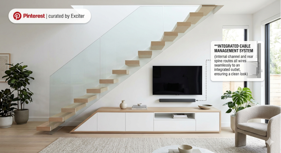 Bagaimana jika tangga berada di dekat ruang keluarga atau area communal? Ini saatnya kamu menciptakan entertainment hub yang sleek, modern, dan super rapi. Manfaatkan ruang bawah tangga sebagai lemari penyimpanan perangkat media seperti TV layar datar, speaker wireless, konsol game, dan segala aksesori pendukungnya. Dengan perencanaan manajemen kabel yang baik menggunakan panel dinding tersembunyi atau cable raceway, kamu bisa menghindari tumpukan kabel berantakan yang biasanya mengganggu pemandangan dan sulit dibersihkan.