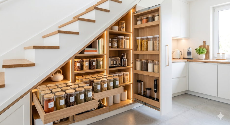 Jika posisi tangga rumahmu beruntung berada di dekat area dapur atau ruang makan, ini adalah kesempatan emas yang tidak boleh disia-siakan! Alih-alih membiarkan sudut tersebut menjadi dead space, ubah area bawah tangga menjadi mini pantry atau tempat penyimpanan bahan makanan kering yang super fungsional. Kamu bisa memasang rak-rak geser (pull-out shelves) yang memudahkan akses ke barang-barang di bagian terdalam tanpa harus merangkak masuk atau menggeser tumpukan barang lain.