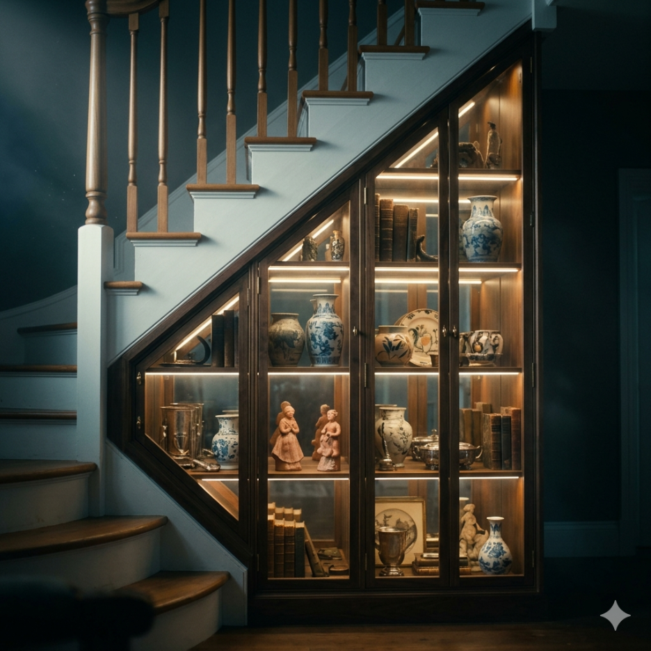 Untuk hasil maksimal, tambahkan strip LED warm white di bagian dalam rak. Pencahayaan ini akan membuat koleksimu tampak seperti di museum mini pribadi, menonjolkan detail ukiran kayu antikmu atau warna-warni keramik koleksi dengan sempurna. Tips tambahan: pilih frame lemari dengan finishing warna yang selaras dengan railing tangga agar tampilan tetap menyatu secara estetik dan terlihat seamless dengan interior rumah secara keseluruhan.