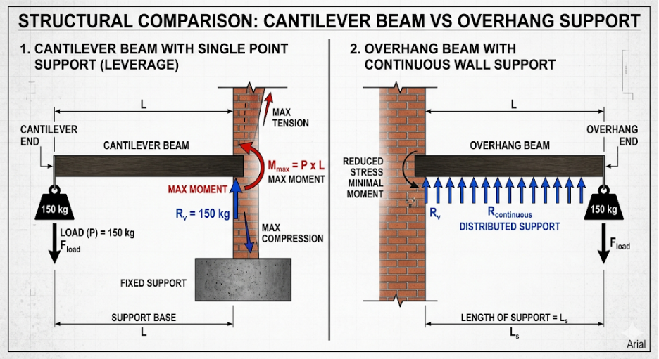 Sistem Penopang Kantilever mengandalkan penopang hanya pada satu titik atau sisi dengan koneksi yang sangat kuat dan rigid, biasanya menggunakan penahan momen (moment connection) yang mampu menahan rotasi. Sebaliknya, overhang didukung secara kontinu oleh dinding atau struktur di belakangnya, mirip seperti meja yang bertumpu pada dinding panjang, bukan satu titik saja.