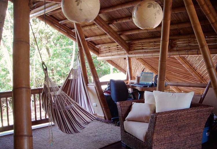 Penggunaan cat warna hitam untuk melapisi rumah bambu lantai atas memberikan nuansa futuristik nan elegan. Jika kamu ingin meniru konsep ini, gunakanlah cat yang memang diperuntukkan untuk mewarnai bambu atau kayu agar tak mudah mengelupas serta menurunkan kulitas bambu.