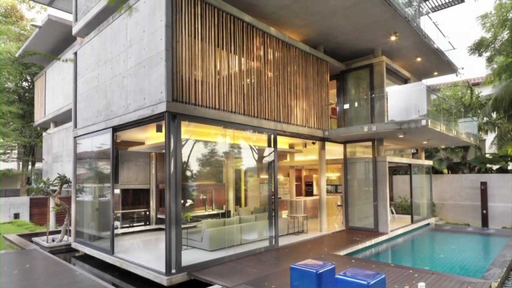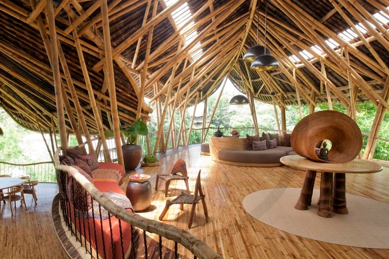 Siapa bilang desain futuristik tak cocok dengan rumah bambu? Rumah bambu berisi empat ruang utama dan dua lantai ini memiliki desain futuristik yang ditunjang dengan penggunaan banyak kaca baik sebagai pintu maupun jendela geser.