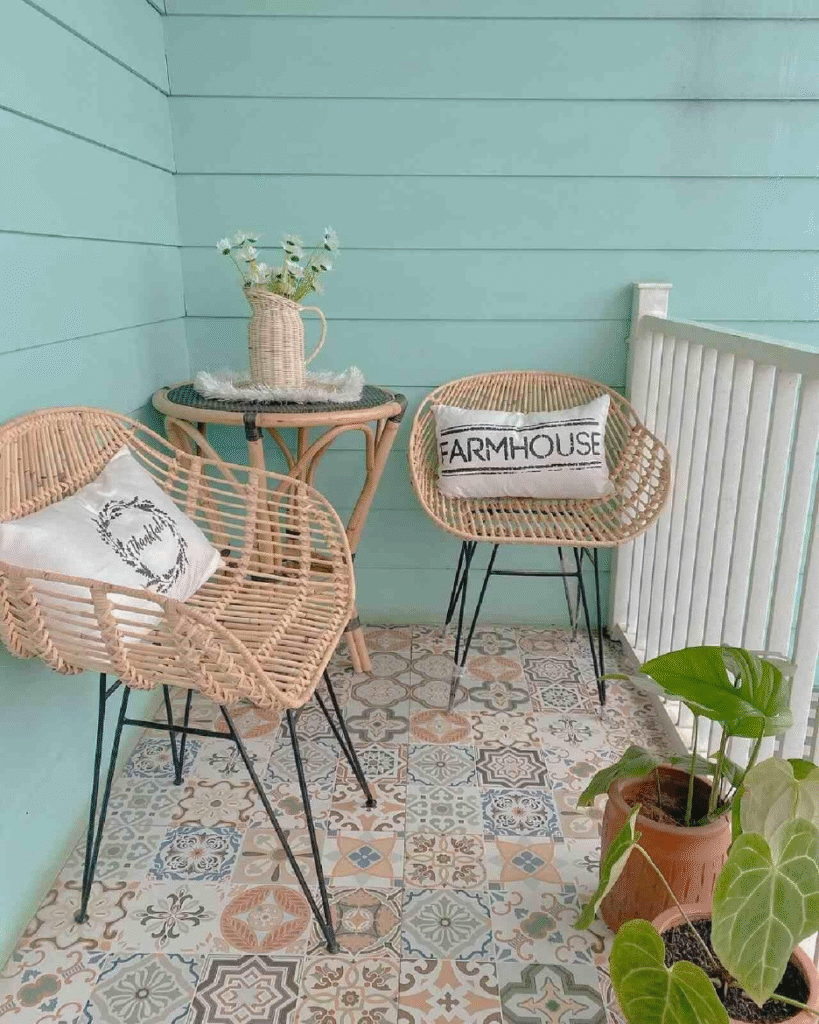 Keramik tegel ini memadukan pola geometris dengan sentuhan elemen klasik. Kombinasi tersebut menghadirkan tampilan teras yang artistik sekaligus hangat. Dengan dominasi warna netral, tegel mudah dipadukan dengan berbagai gaya furnitur, mulai dari rotan, kayu, hingga besi.