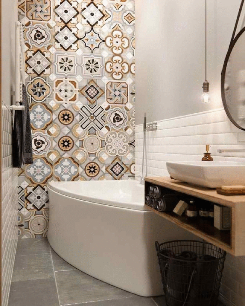 Desain tegel yang kaya akan pola dengan warna hangat, seperti cokelat, krem, biru, dan abu-abu menciptakan kontras indah dengan elemen kamar mandi modern yang cenderung polos, seperti bak mandi putih, wastafel, dan keramik dinding bergaya subway tile.