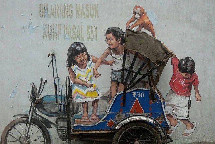 Gambar mural yang ada di kawasan Jalan Perdana, Pasar Hindu ini masih merupakan karya Ernest Zacharevic. Kedua karyanya di Medan ini menjadi viral di media sosial karena gambarnya keren dan memiliki makna tersendiri.