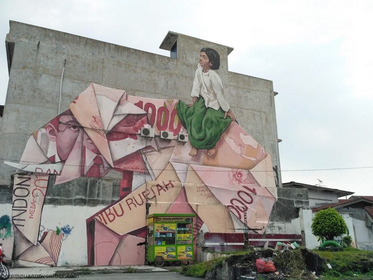 Gambar mural pada gedung bekas berikutnya ada di Medan. Karya Ernest Zhacarevic ini memiliki makna yang dalam. Lukisan dinding seorang gadis berada di atas lipatan uang menggambarkan anak-anak zaman sekarang yang sudah tidak bisa bermain dengan bebas karena lahan main mereka berubah menjadi lahan bisnis para orang-orang yang serakah akan harta.